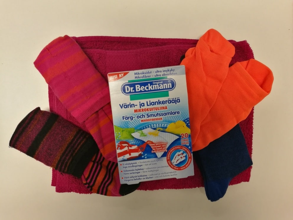Dr. Beckmann tarjoaa pulmaan ratkaisua: sekä valkoiset että värilliset pyykit voi panna samaan pyykkiin, kun koneeseen laittaa väriä keräävän mikrokuituliinan.